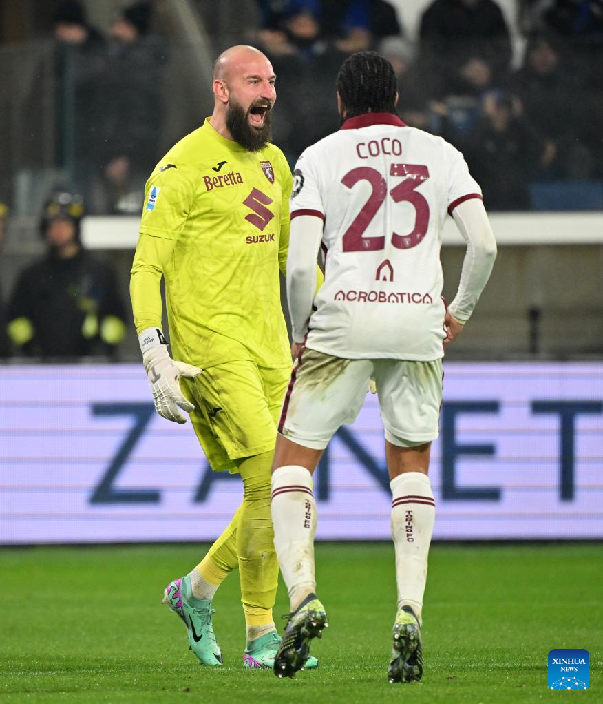 Torino's goalkeeper Vanja Milinkovic-Savic (L) celebrates after saving the penalty kick by Atalanta's Mateo Retegui during a Serie A football match between Atalanta and Torino in Bergamo, Italy, Feb. 1, 2025. (Photo by Alberto Lingria/Xinhua)