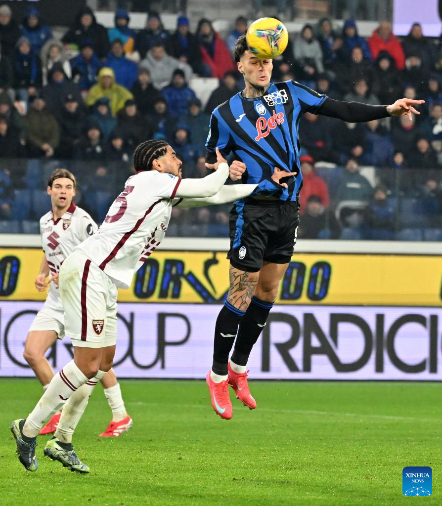 Atalanta's Gianluca Scamacca (R) vies with Torino's Saul Coco during a Serie A football match between Atalanta and Torino in Bergamo, Italy, Feb. 1, 2025. (Photo by Alberto Lingria/Xinhua)