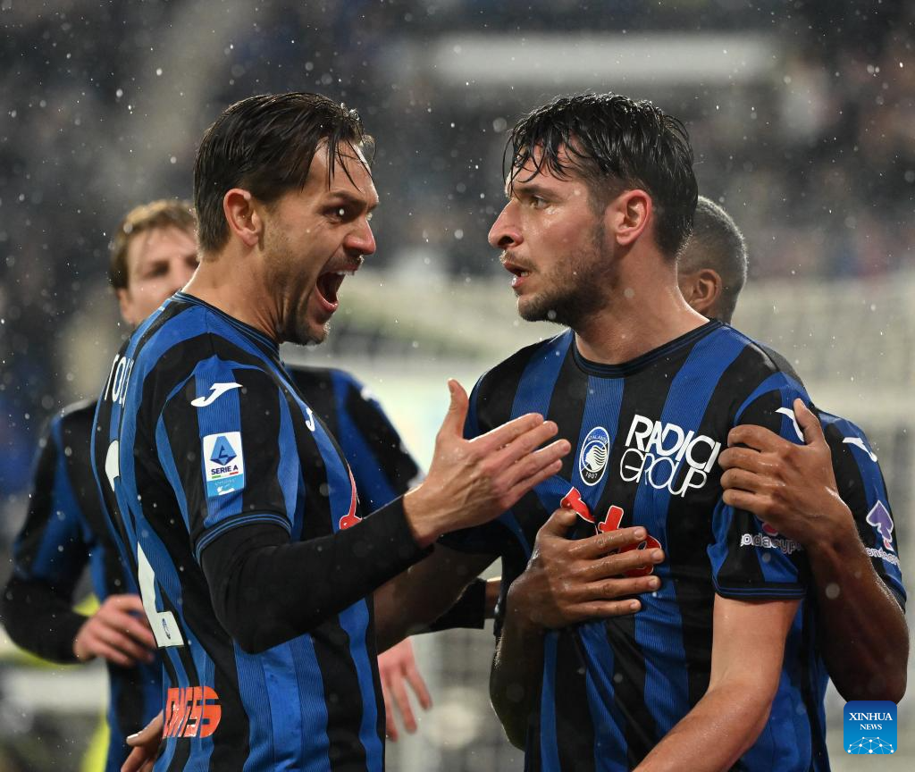 Atalanta's Berat Djimsiti (3rd L) celebrates his goal during a Serie A football match between Atalanta and Torino in Bergamo, Italy, Feb. 1, 2025. (Photo by Alberto Lingria/Xinhua)