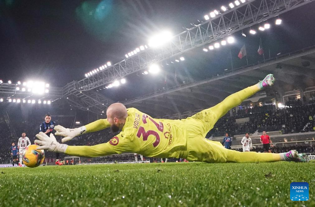 Torino's goalkeeper Vanja Milinkovic-Savic (front) blocks the penalty kick by Atalanta's Mateo Retegui during a Serie A football match between Atalanta and Torino in Bergamo, Italy, Feb. 1, 2025. (Photo by Alberto Lingria/Xinhua)