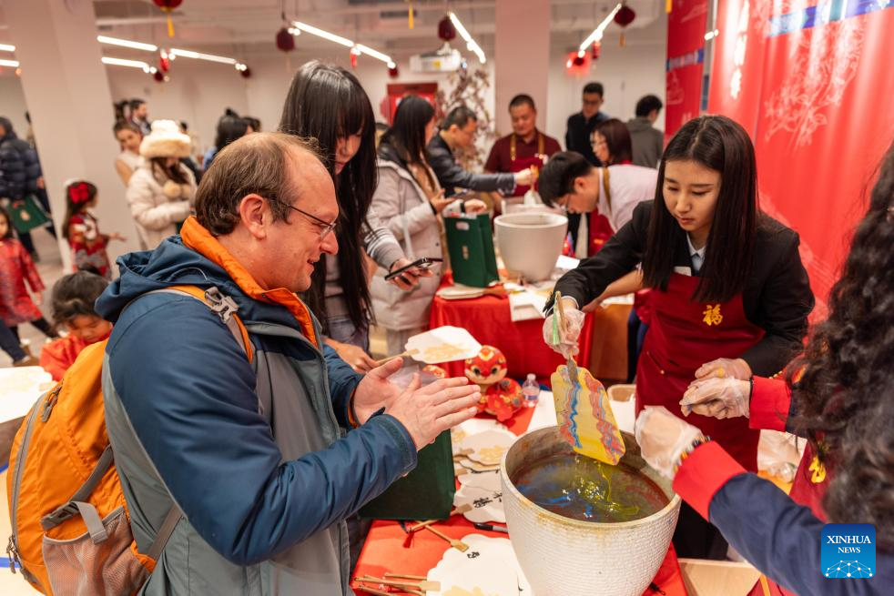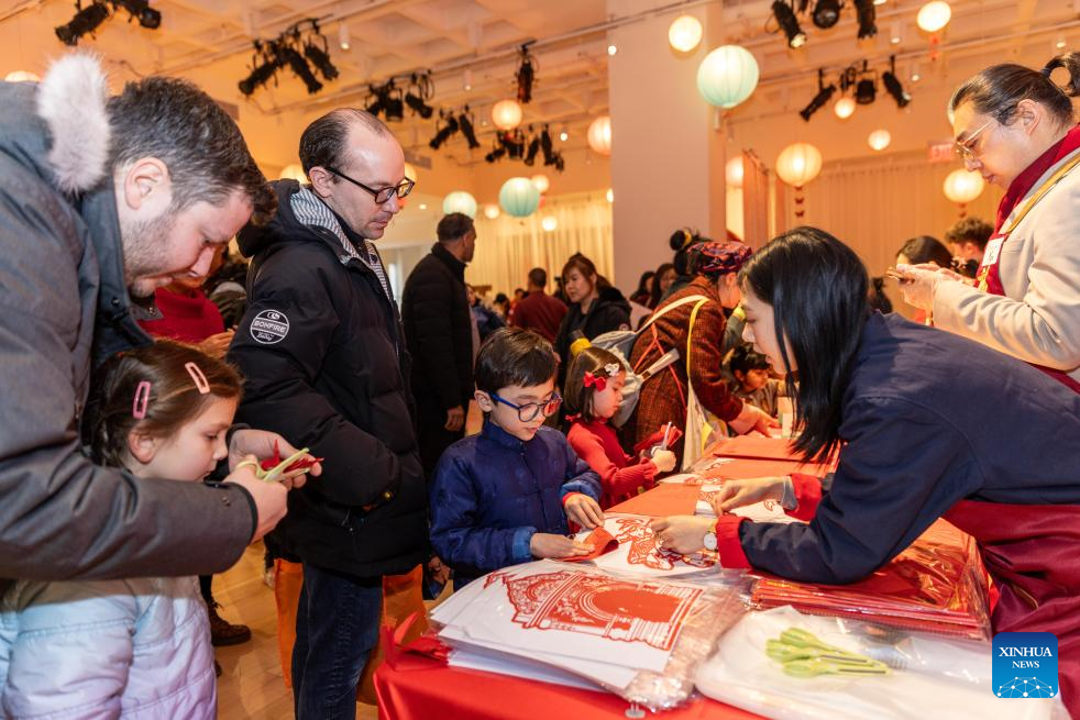 Visitors experience paper cutting in New York City, the United States, on Feb. 2, 2025. Prince Kung's Palace Museum, one of the top-level museums and tourist sites in China, gave a new flavor to the Chinese New Year celebrations in the New York metropolitan area as it concluded its two-week visit to the United States. (Photo by Winston Zhou/Xinhua)