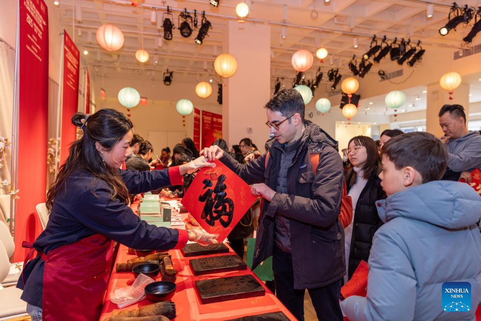 Visitors print Chinese character "Fu" (fortune) with woodblock in New York City, the United States, on Feb. 2, 2025. Prince Kung's Palace Museum, one of the top-level museums and tourist sites in China, gave a new flavor to the Chinese New Year celebrations in the New York metropolitan area as it concluded its two-week visit to the United States. (Photo by Winston Zhou/Xinhua)