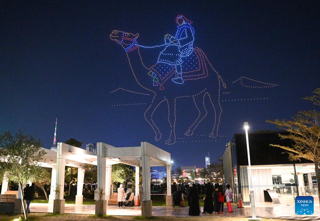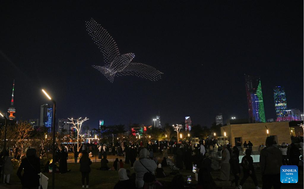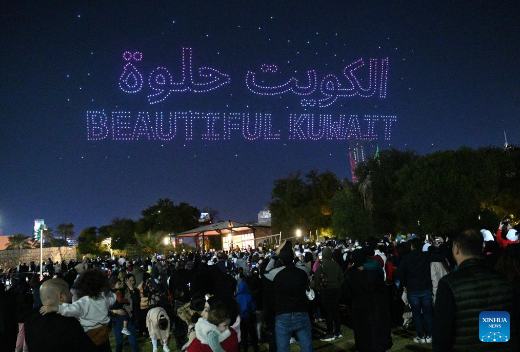 People watch a drone light show in Kuwait City, Kuwait, Feb. 2, 2025. (Photo by Asad/Xinhua)