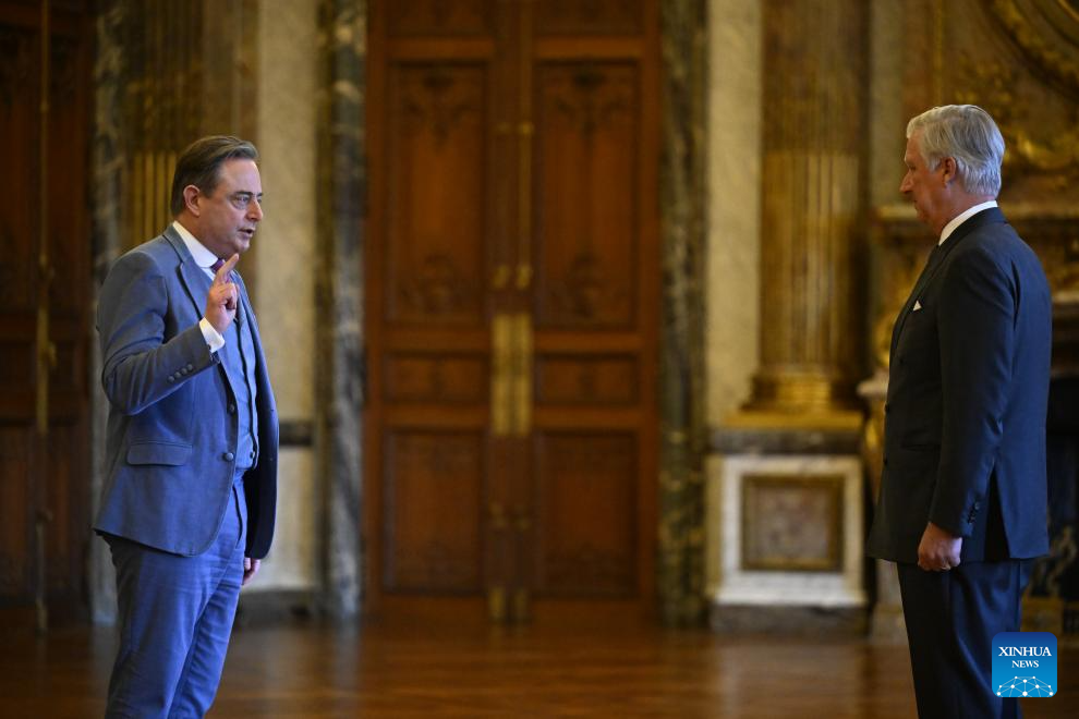 Bart De Wever (L) is sworn in as Belgium's prime minister at the Royal Palace in Brussels, Belgium, Feb. 3, 2025. Belgium's new government was sworn in on Monday, ending months of a political deadlock over forming a stable coalition government. (Belga News Agency via Xinhua)