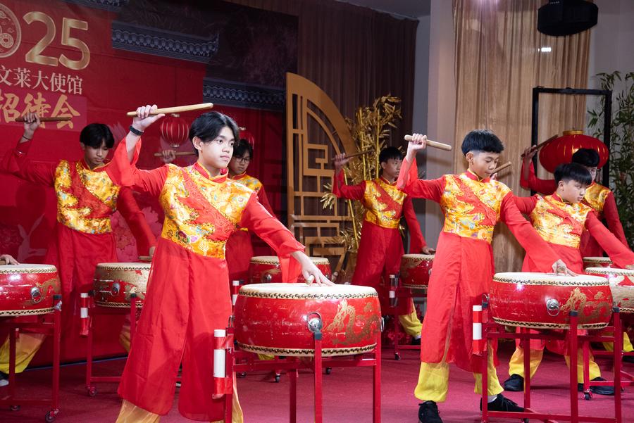Performers play drums during a Spring Festival reception held by the Chinese embassy in Bandar Seri Begawan, Brunei, Jan. 26, 2025. (Xinhua/Li Meng)