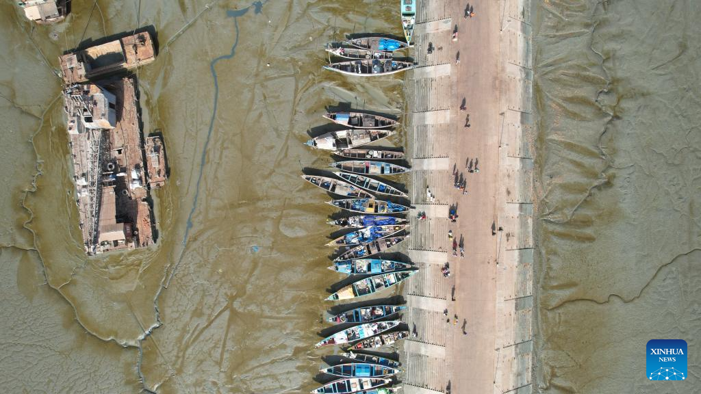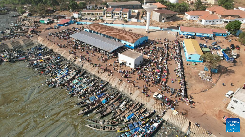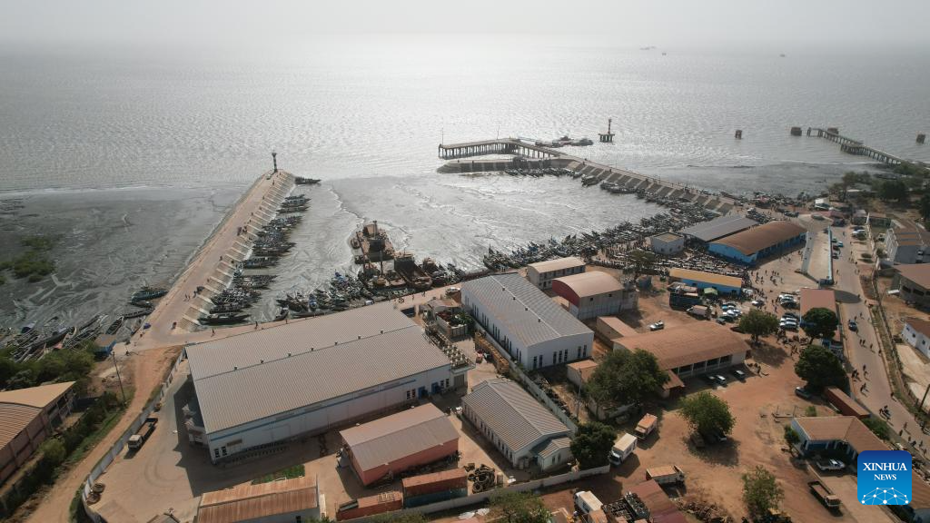 An aerial drone photo taken on Feb. 2, 2025 shows the Bandim Fisheries Wharf in Bissau, the capital of Guinea-Bissau. (Xinhua/Si Yuan)