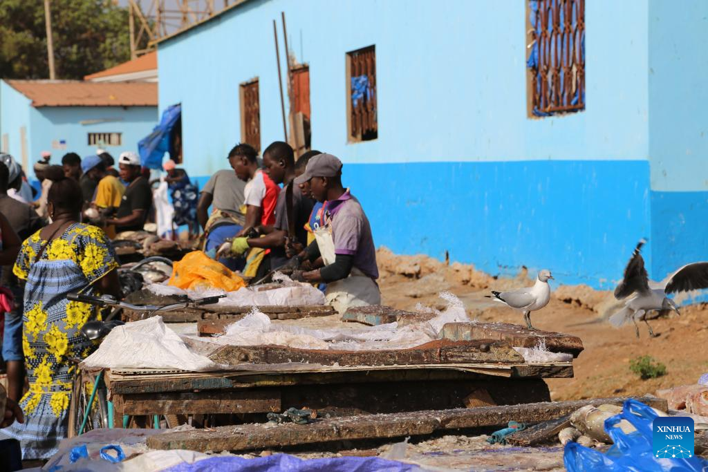 This photo taken on Feb. 2, 2025 shows the fish market at the Bandim Fisheries Wharf in Bissau, the capital of Guinea-Bissau. (Xinhua/Si Yuan)