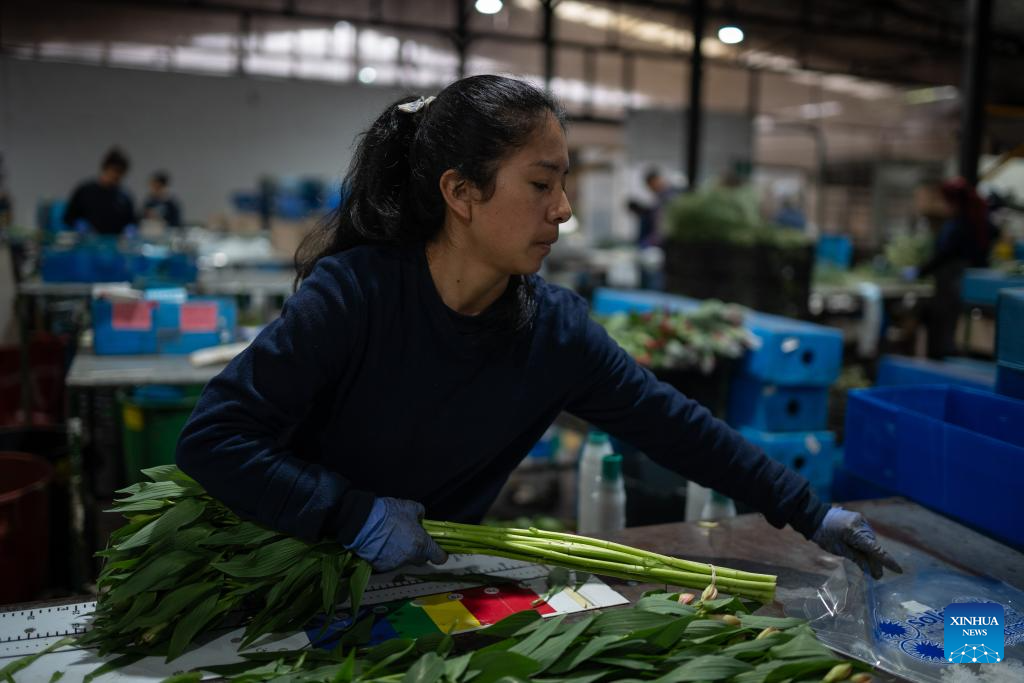 A worker wraps flowers at a flower cultivation base in Cundinamarca, Colombia, Feb. 5, 2025. (Photo by Andres Moreno/Xinhua)