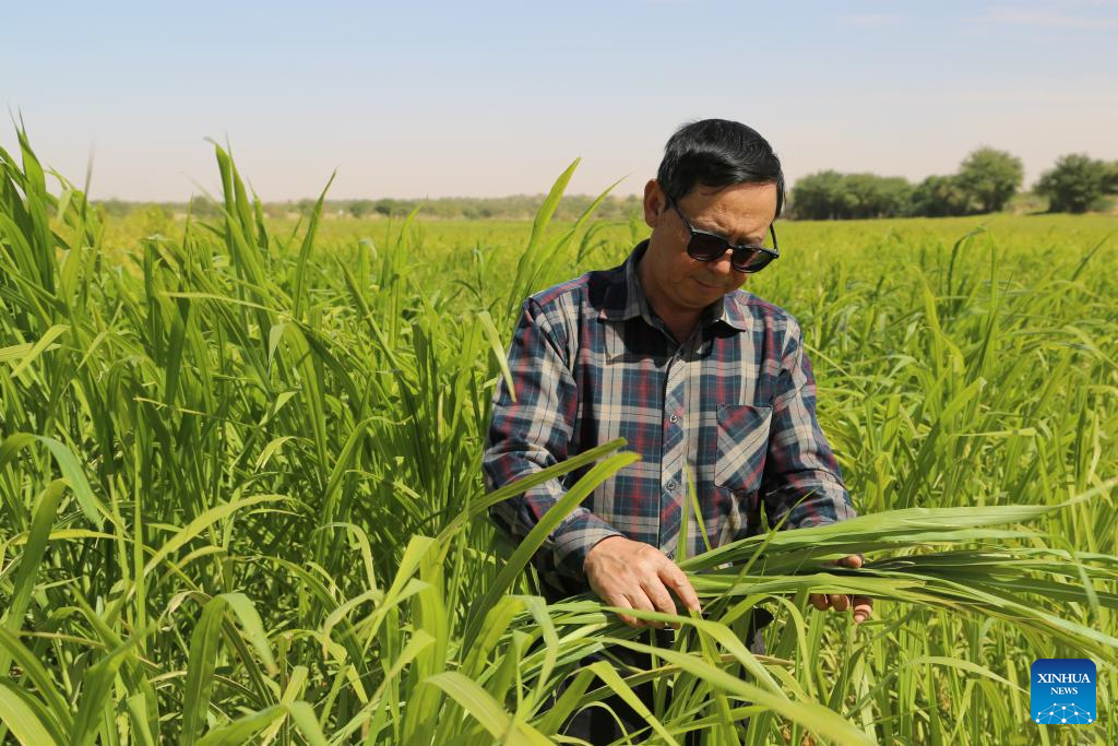 Zhang Hong'en, director of the Livestock Demonstration Center in Mauritania, checks the growth of Juncao grass in a test field at the village of Idini in Mauritania, Jan. 18, 2025. (Xinhua/Si Yuan)