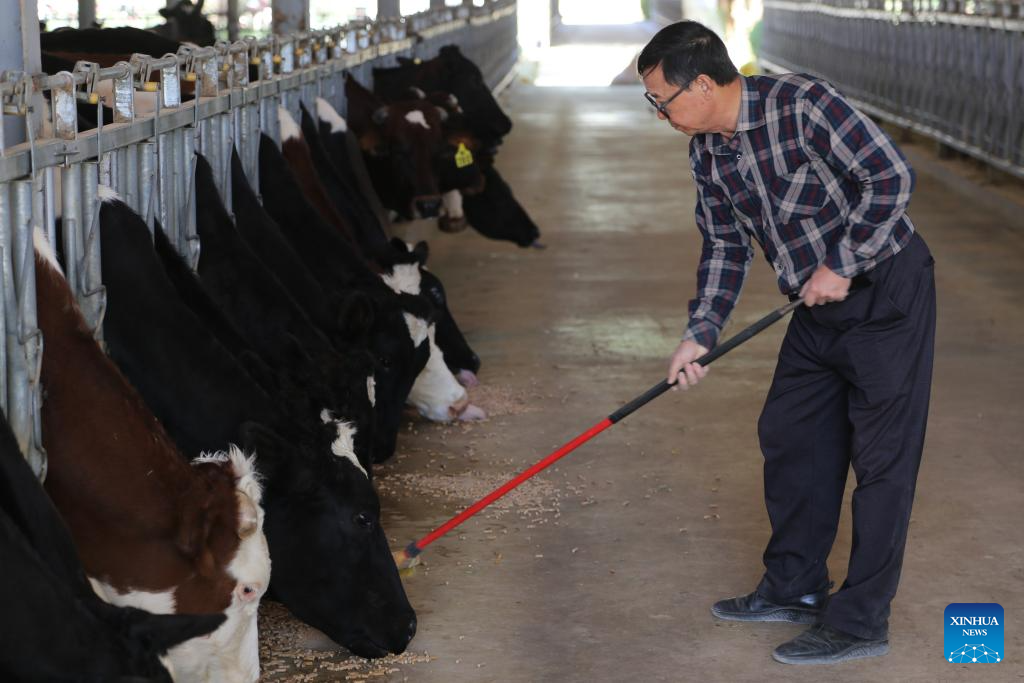 Zhang Hong'en, director of the Livestock Demonstration Center in Mauritania, feeds cows at the village of Idini in Mauritania, Jan. 18, 2025. (Xinhua/Si Yuan)