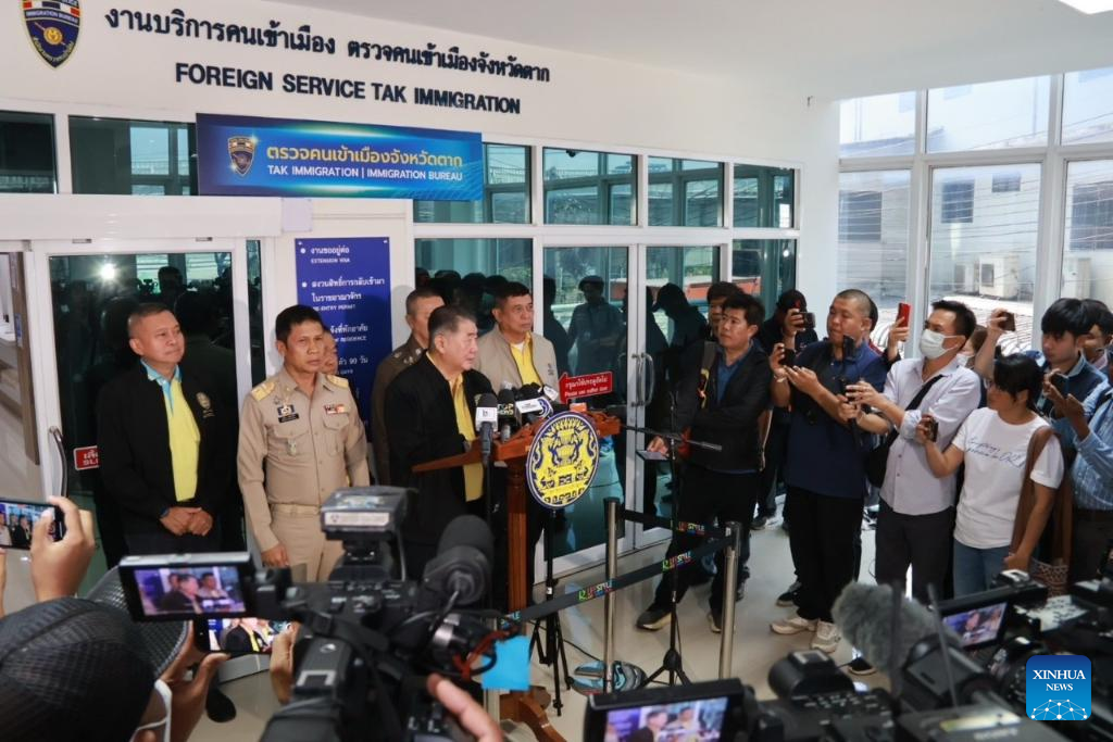Thai Deputy Prime Minister Phumtham Wechayachai (C) attends a press conference in Tak province, Thailand, Feb. 6, 2025. Thai authorities have received 61 foreign nationals believed to be victims of human trafficking and scam operations in Myanmar, Wechayachai said on Thursday.