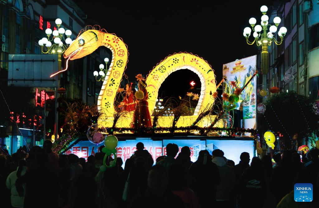 A float is seen during a parade in Shibing County of Qiandongnan Miao and Dong Autonomous Prefecture, southwest China's Guizhou Province, Feb. 6, 2025. "Shibing dragon lantern", a provincial intangible cultural heritage in Guizhou, is a festive dragon lantern dance in Shibing County and featured by the fantastic performance amid fireworks.