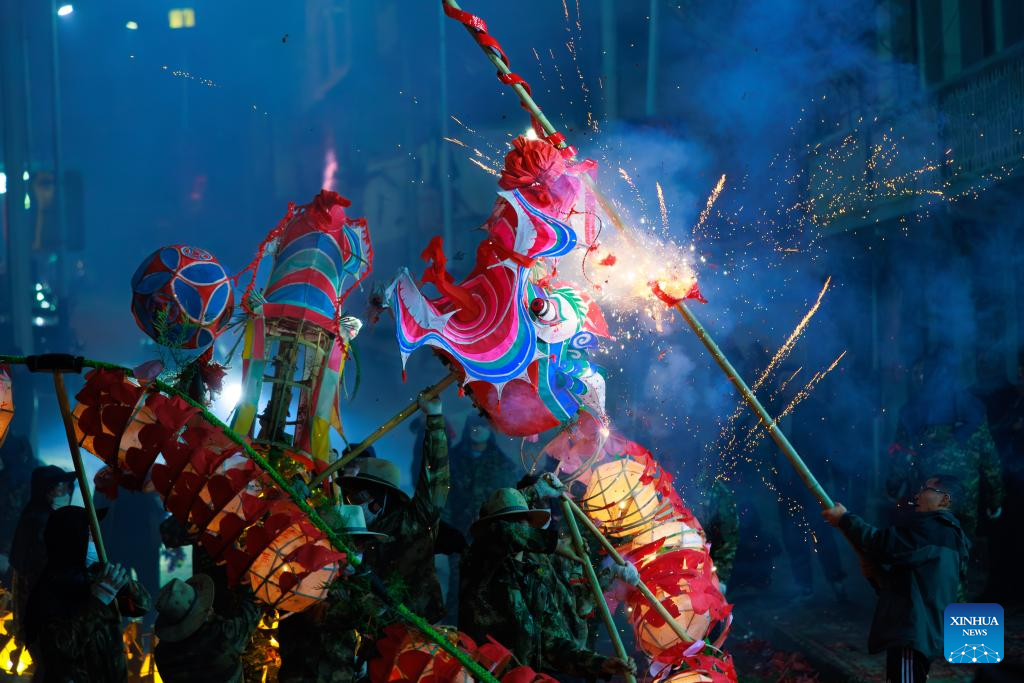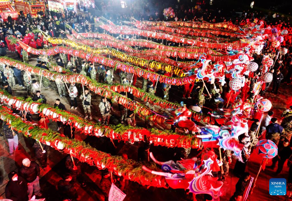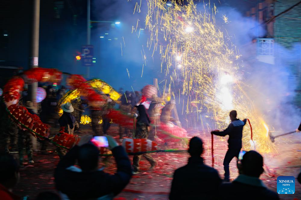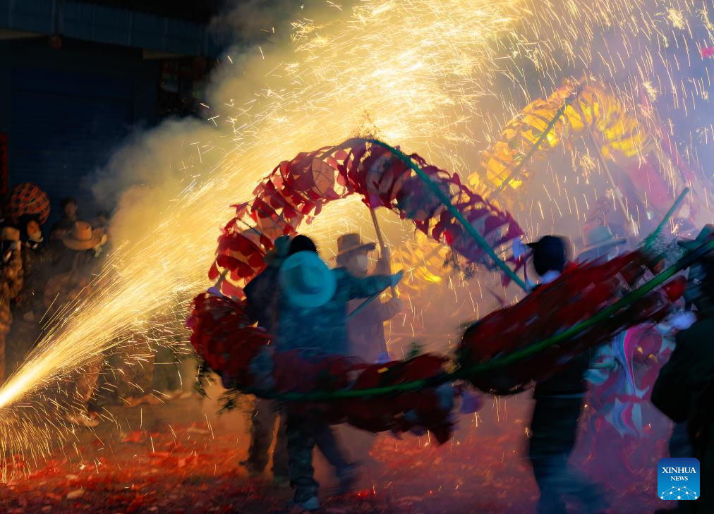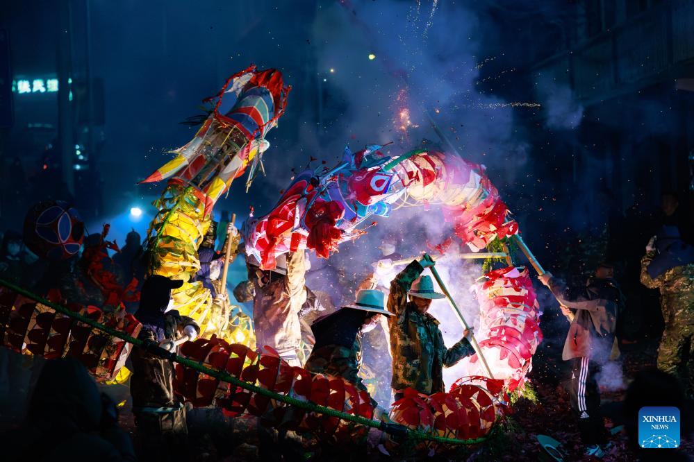 Dragon dancers perform in Shibing County of Qiandongnan Miao and Dong Autonomous Prefecture, southwest China's Guizhou Province, Feb. 6, 2025. "Shibing dragon lantern", a provincial intangible cultural heritage in Guizhou, is a festive dragon lantern dance in Shibing County and featured by the fantastic performance amid fireworks.