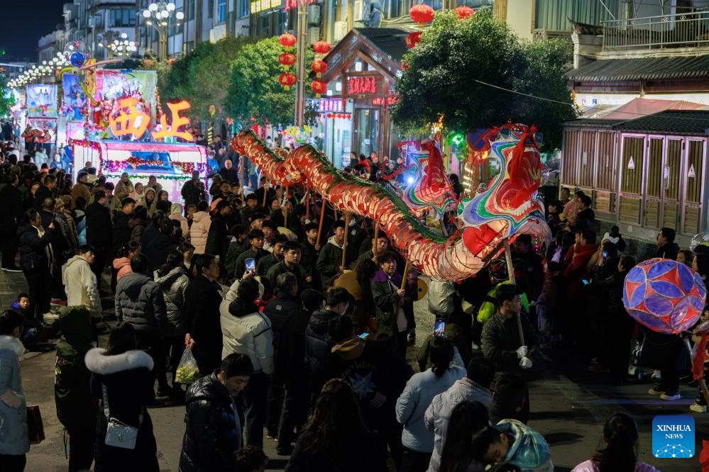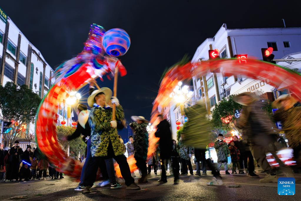 Performers are seen during a dragon lantern parade in Shibing County of Qiandongnan Miao and Dong Autonomous Prefecture, southwest China's Guizhou Province, Feb. 6, 2025. "Shibing dragon lantern", a provincial intangible cultural heritage in Guizhou, is a festive dragon lantern dance in Shibing County and featured by the fantastic performance amid fireworks.