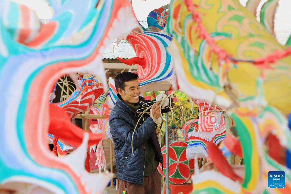 A folk artisan makes a dragon lantern in Shibing County of Qiandongnan Miao and Dong Autonomous Prefecture, southwest China's Guizhou Province, Jan. 16, 2025. "Shibing dragon lantern", a provincial intangible cultural heritage in Guizhou, is a festive dragon lantern dance in Shibing County and featured by the fantastic performance amid fireworks.