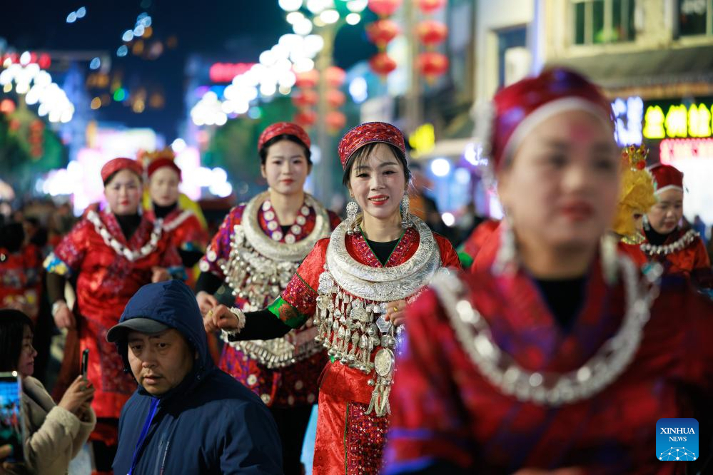 People in ethnic costume parade in Shibing County of Qiandongnan Miao and Dong Autonomous Prefecture, southwest China's Guizhou Province, Feb. 6, 2025. "Shibing dragon lantern", a provincial intangible cultural heritage in Guizhou, is a festive dragon lantern dance in Shibing County and featured by the fantastic performance amid fireworks.