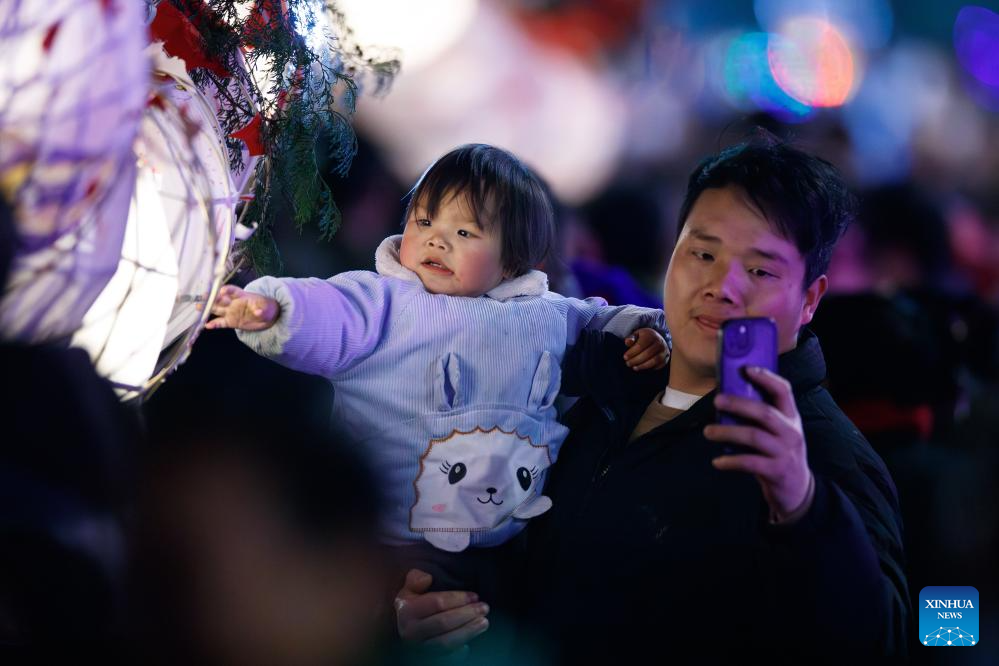 A little girl touches a dragon lantern in Shibing County of Qiandongnan Miao and Dong Autonomous Prefecture, southwest China's Guizhou Province, Feb. 6, 2025. "Shibing dragon lantern", a provincial intangible cultural heritage in Guizhou, is a festive dragon lantern dance in Shibing County and featured by the fantastic performance amid fireworks.