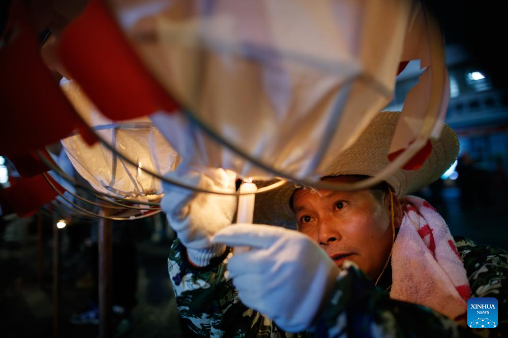 A dragon dancer lights a candle inside a dragon lantern in Shibing County of Qiandongnan Miao and Dong Autonomous Prefecture, southwest China's Guizhou Province, Feb. 6, 2025. "Shibing dragon lantern", a provincial intangible cultural heritage in Guizhou, is a festive dragon lantern dance in Shibing County and featured by the fantastic performance amid fireworks.
