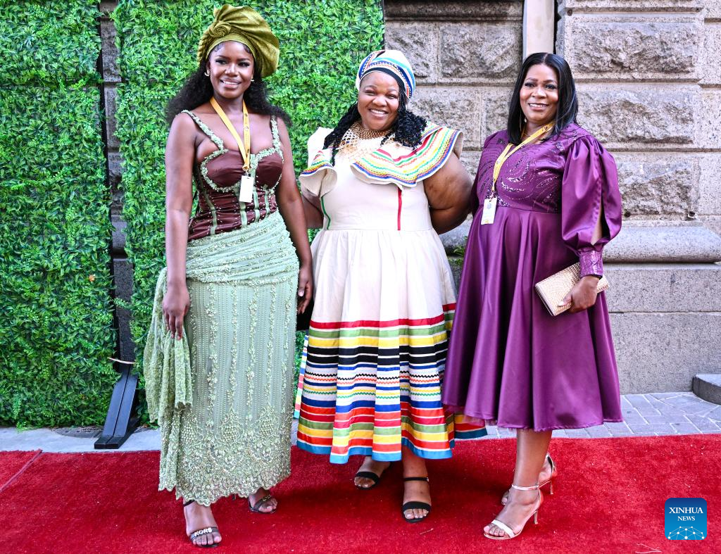 South African members of parliament in local attires arrive at the Cape Town City Hall to attend the State of the Nation Address in Cape Town, South Africa, on Feb. 6, 2025. South African President Cyril Ramaphosa said on Thursday that his government will initiate a fresh wave of reforms to drive inclusive economic growth that benefits all citizens. (Photo by Xabiso Mkhabela/Xinhua)