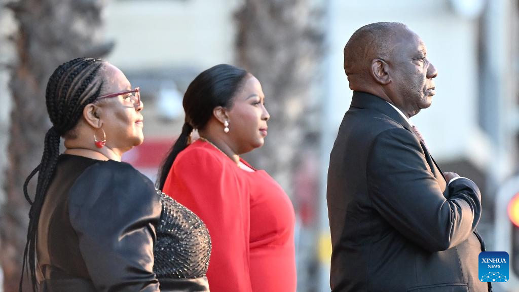 South African President Cyril Ramaphosa (1st R) stands for the national anthem before delivering the State of the Nation Address at the Cape Town City Hall in Cape Town, South Africa, on Feb. 6, 2025. Ramaphosa said on Thursday that his government will initiate a fresh wave of reforms to drive inclusive economic growth that benefits all citizens. (Photo by Xabiso Mkhabela/Xinhua)