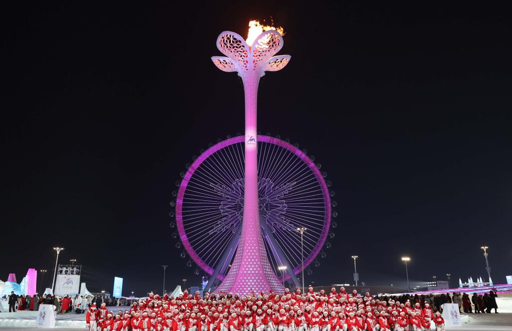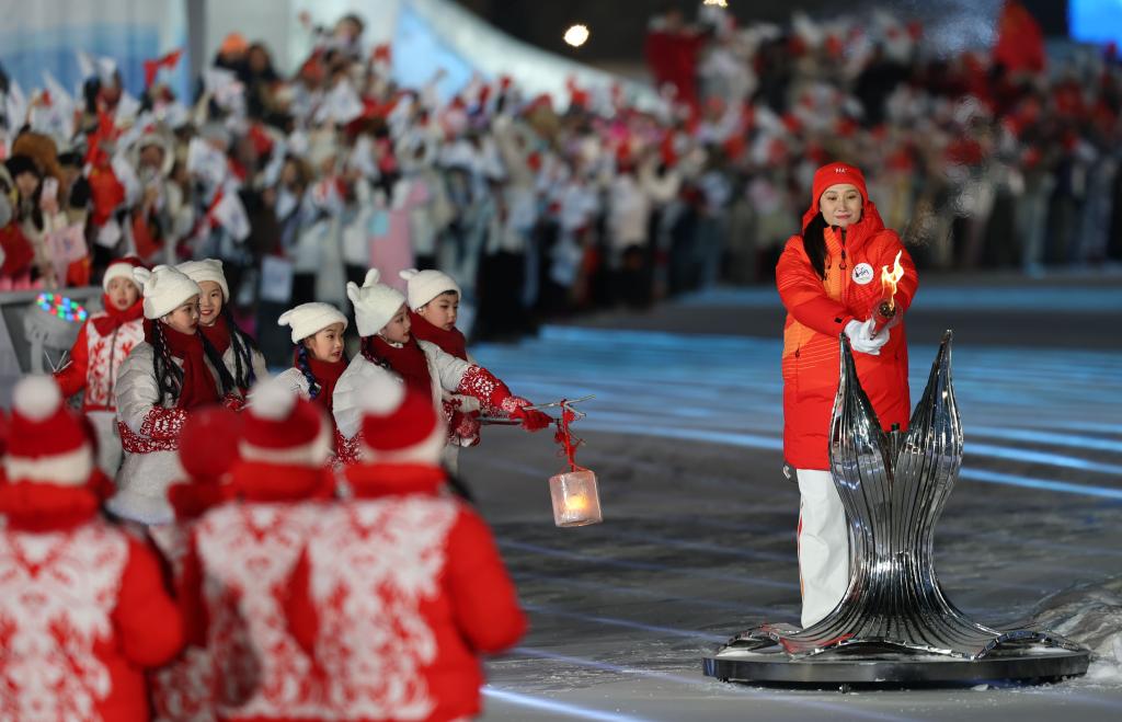 Joined by children holding ice lanterns, China's first Winter Olympic champion and short track speed skater Yang Yang, China's first male Winter Olympic gold medalist and freestyle skier Han Xiaopeng, Olympic race walk champion Wang Zhen, and Sochi Winter Olympic speed skating champion Zhang Hong lit the cauldron in a shape of a blooming lilac flower at the Harbin Ice-Snow World, the world's largest ice-and-snow theme park.