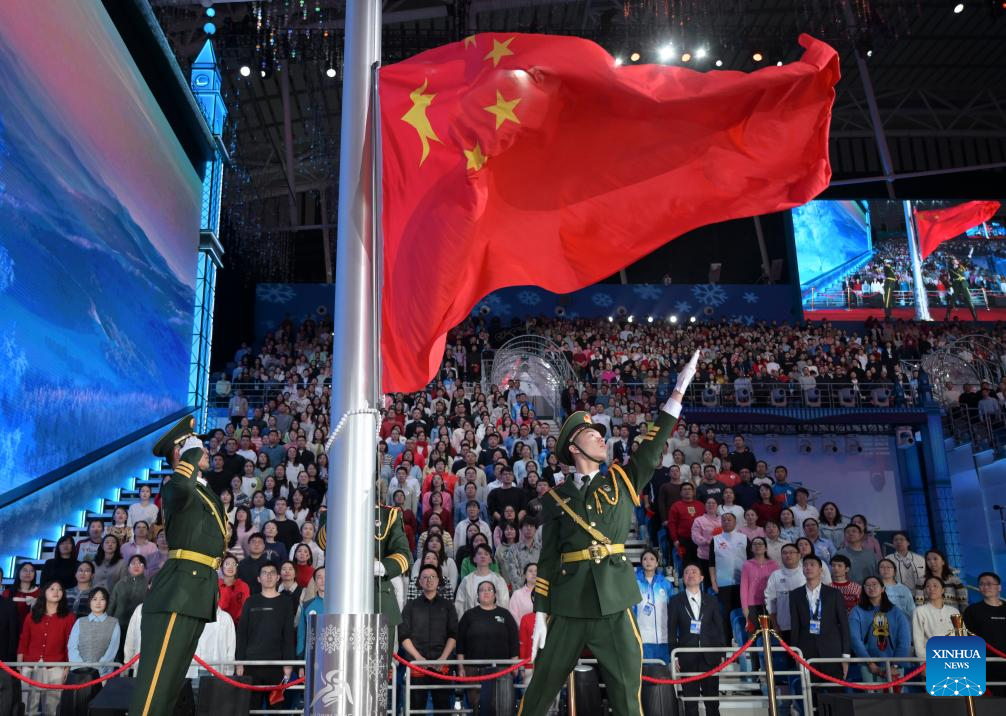 The Chinese national flag is raised during the opening ceremony of the 9th Asian Winter Games in Harbin, northeast China's Heilongjiang Province, Feb. 7, 2025. (Xinhua/Huang Wei)