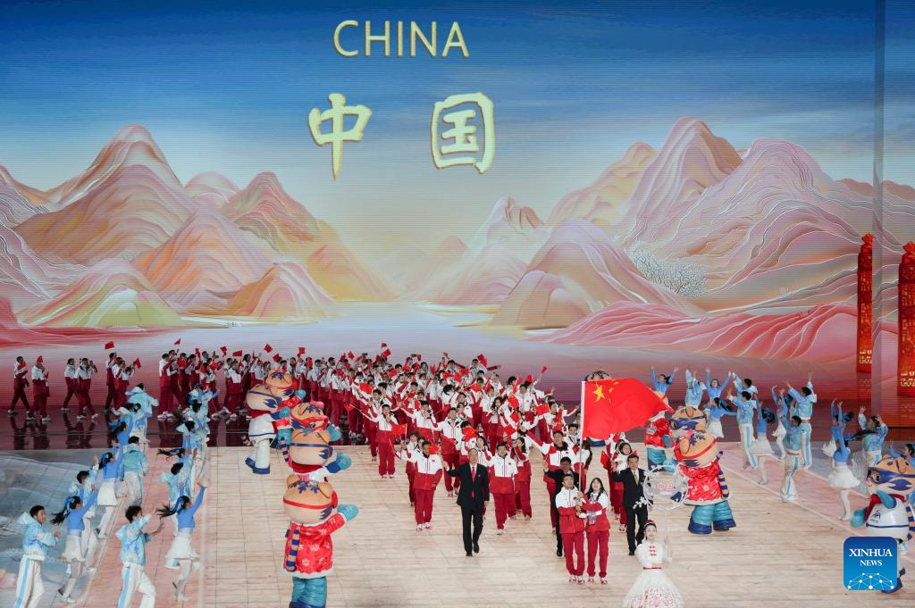 Delegation of China parade during the opening ceremony of the 9th Asian Winter Games in Harbin, northeast China's Heilongjiang Province, Feb. 7, 2025. (Xinhua/Wang Jianwei)