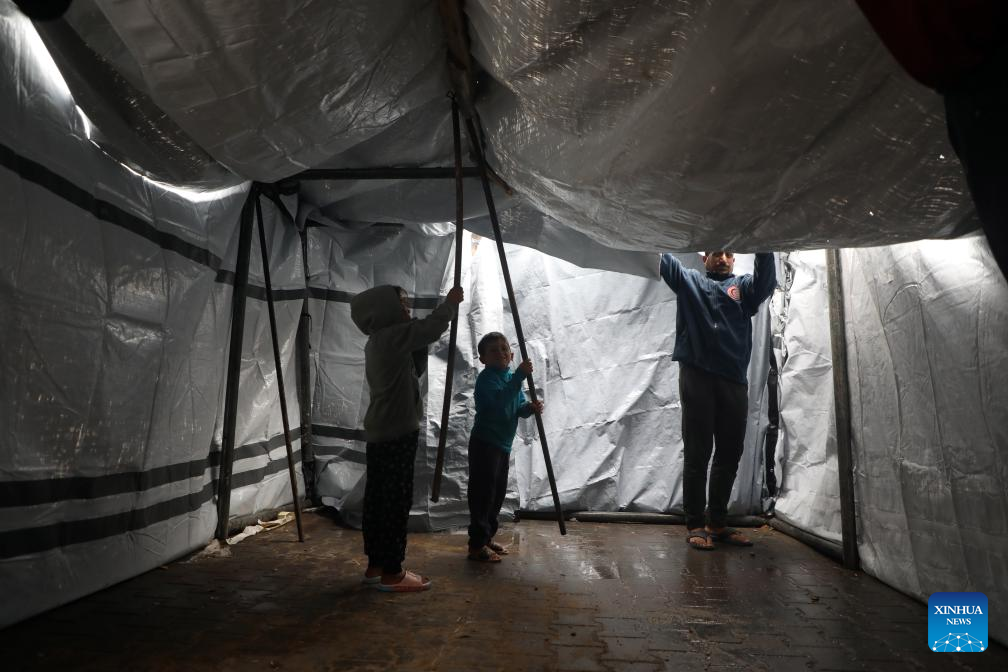 "I tried to shelter inside my tent with my daughter and husband, but the strong wind tore our tent apart, and we were left exposed to the cold," Halima Baraka, a mother living in a temporary tent in the city of Deir al-Balah, central Gaza, told Xinhua.