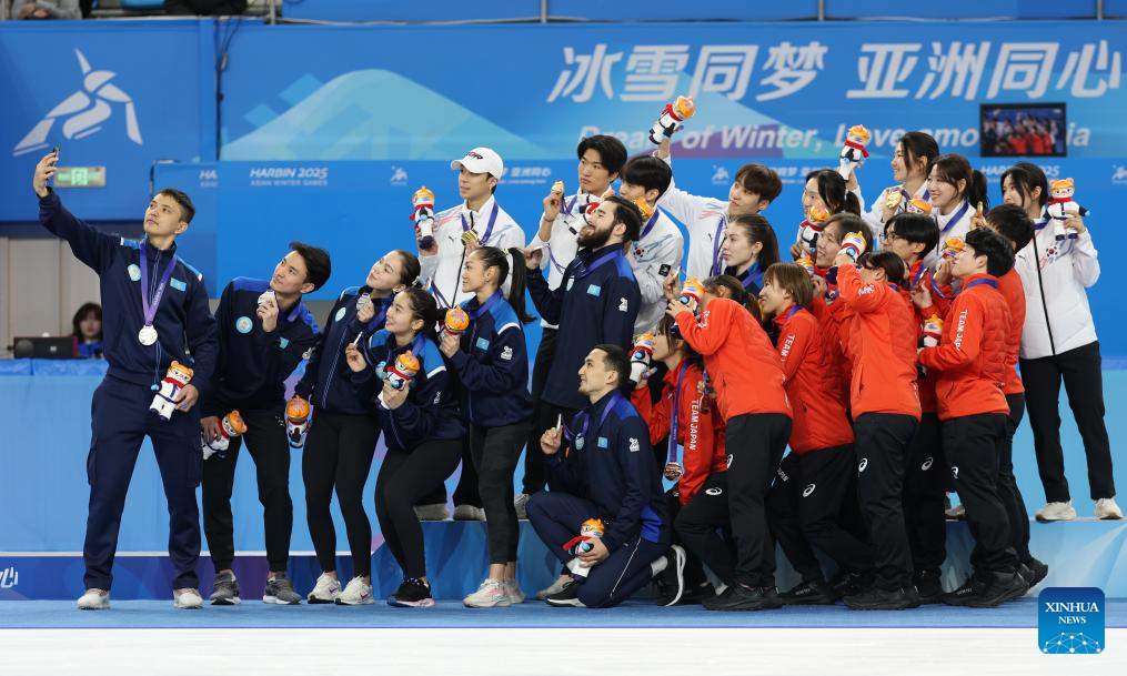 Gold medalists team South Korea, silver medalists team Kazakhstan and bronze medalists team Japan pose for selfies during the awarding ceremony of the mixed 2000m relay final match of the short track speed skating event at the 9th Asian Winter Games in Harbin, northeast China's Heilongjiang Province, Feb. 8, 2025. (Xinhua/Zhang Tao)