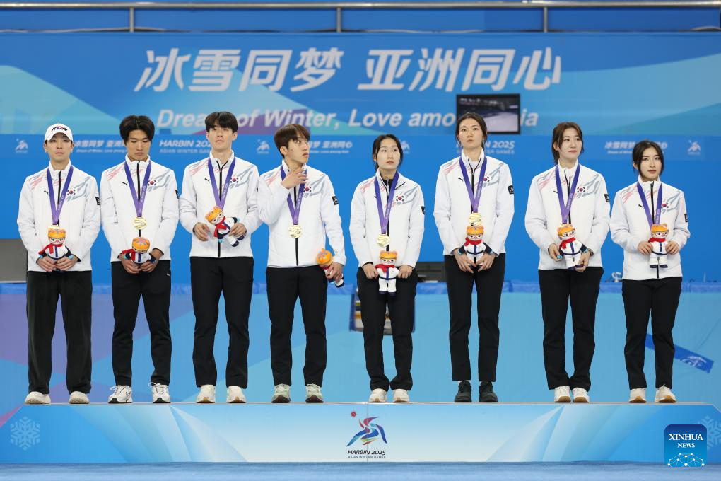 Gold medalists team South Korea attend the awarding ceremony of the mixed 2000m relay final match of the short track speed skating event at the 9th Asian Winter Games in Harbin, northeast China's Heilongjiang Province, Feb. 8, 2025. (Xinhua/Zhang Tao)