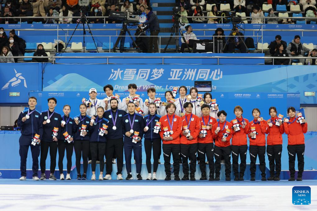 Gold medalists team South Korea (rear), silver medalists team Kazakhstan (L) and bronze medalists team Japan attend the awarding ceremony of the mixed 2000m relay final match of the short track speed skating event at the 9th Asian Winter Games in Harbin, northeast China's Heilongjiang Province, Feb. 8, 2025. (Xinhua/Zhang Tao)