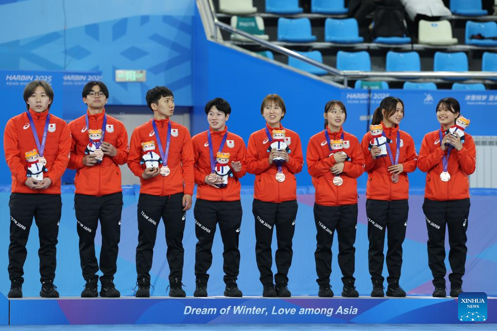 Bronze medalists team Japan attend the awarding ceremony of the mixed 2000m relay final match of the short track speed skating event at the 9th Asian Winter Games in Harbin, northeast China's Heilongjiang Province, Feb. 8, 2025. (Xinhua/Zhang Tao)