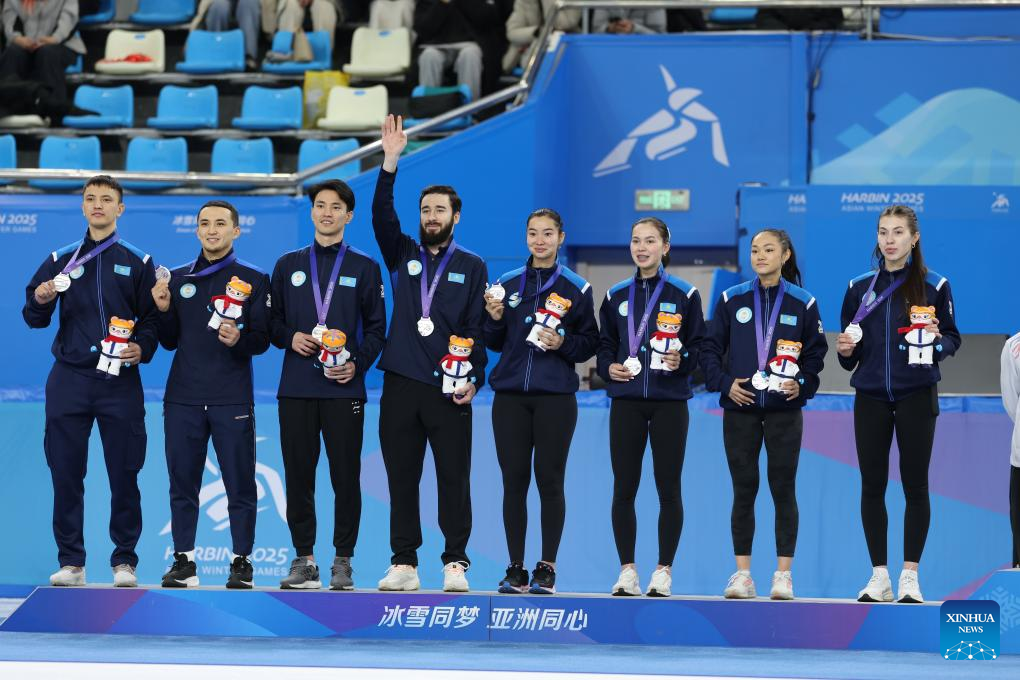 Silver medalists team Kazakhstan attend the awarding ceremony of the mixed 2000m relay final match of the short track speed skating event at the 9th Asian Winter Games in Harbin, northeast China's Heilongjiang Province, Feb. 8, 2025. (Xinhua/Zhang Tao)
