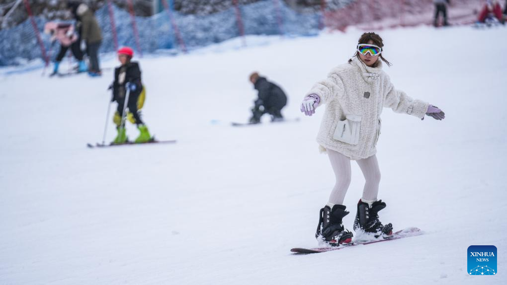 Visitors experience skiing at a ski resort in Liupanshui City, southwest China's Guizhou Province, Feb. 7, 2025. Liupanshui City has made efforts to unleash its advantage in ice-and-snow tourism resources to ramp up the development of ice-and-snow economy. (Xinhua/Tao Liang)