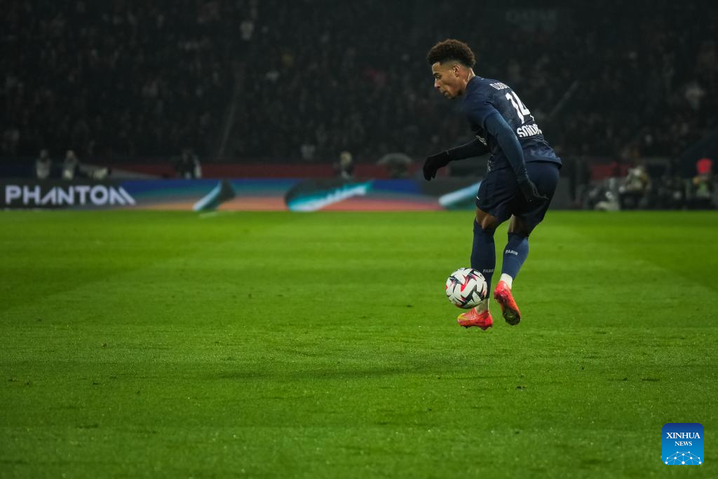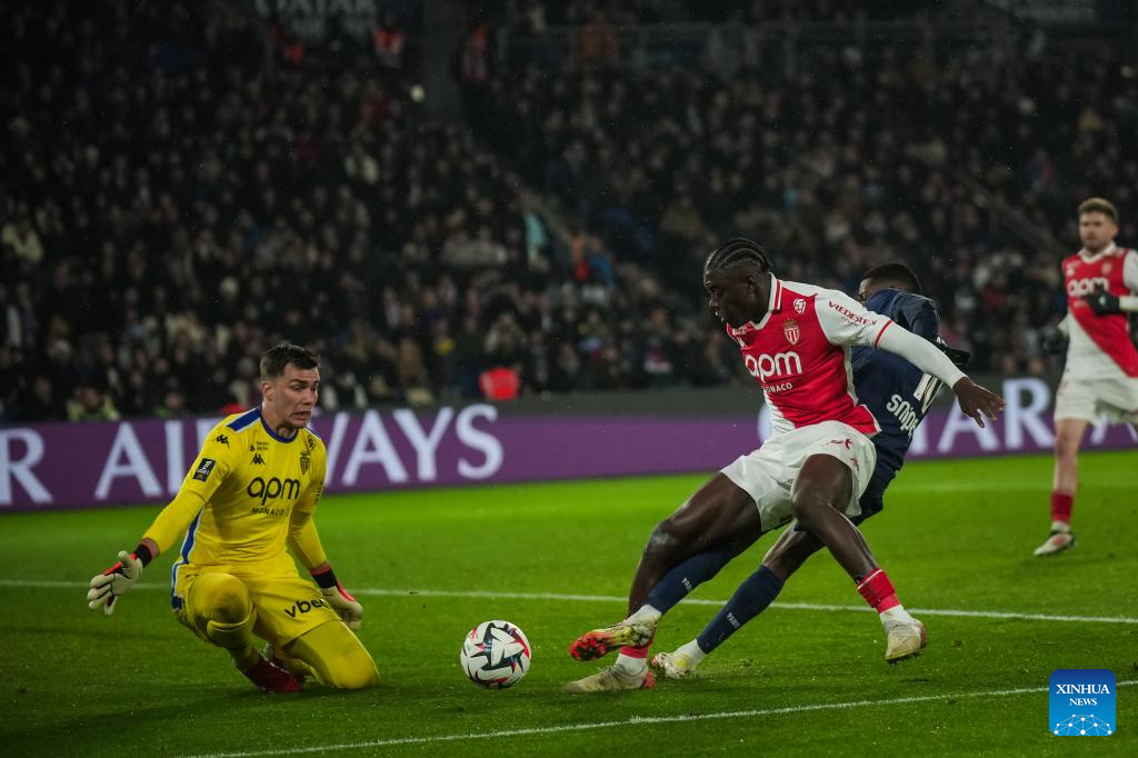 Desire Doue of Paris Saint Germain (PSG) controls the ball during a French Ligue 1 football match between Paris Saint Germain (PSG) and AS Monaco in Paris, France, Feb. 7, 2025. (Photo by Aurelien Morissard/Xinhua)