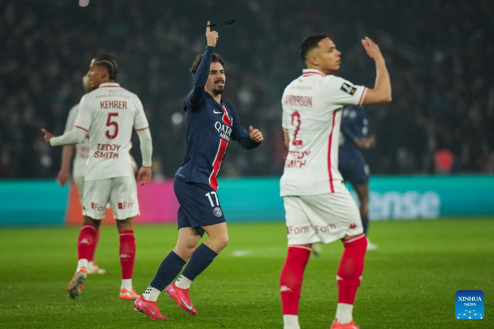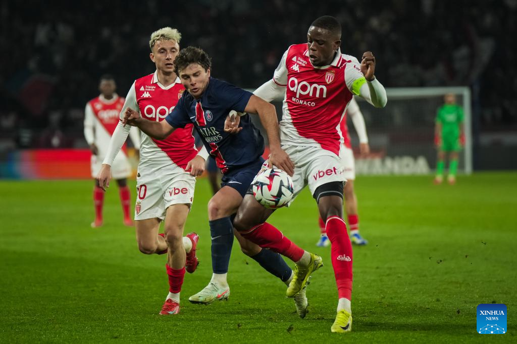 Joao Neves (C) of Paris Saint Germain (PSG) competes during a French Ligue 1 football match between Paris Saint Germain (PSG) and AS Monaco in Paris, France, Feb. 7, 2025. (Photo by Aurelien Morissard/Xinhua)