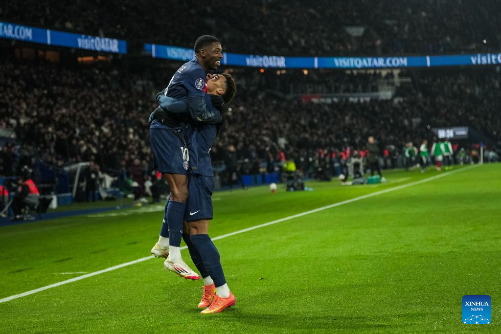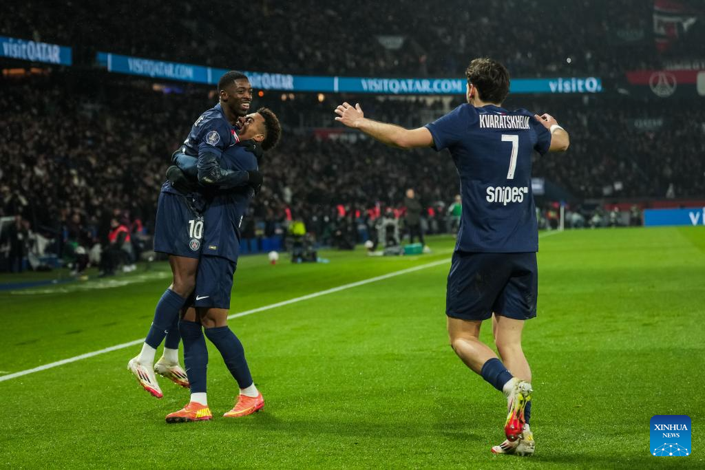 Ousmane Dembele (L) of Paris Saint Germain (PSG) celebrates with his teammate Desire Doue (C) after scoring their team's third goal during a French Ligue 1 football match between Paris Saint Germain (PSG) and AS Monaco in Paris, France, Feb. 7, 2025. (Photo by Aurelien Morissard/Xinhua)
