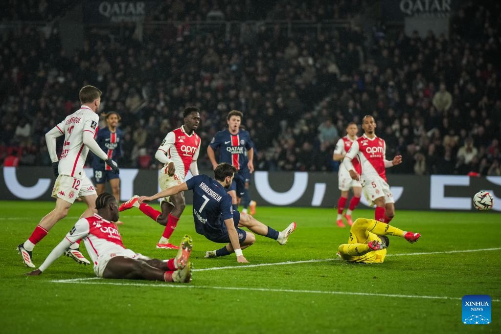Khvicha Kvaratskhelia (C, front) of Paris Saint Germain (PSG) scores PSG's second goal during a French Ligue 1 football match between Paris Saint Germain (PSG) and AS Monaco in Paris, France, Feb. 7, 2025. (Photo by Aurelien Morissard/Xinhua)