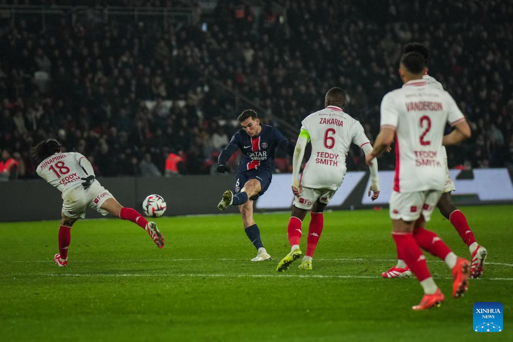 Fabian Ruiz (2nd L) of Paris Saint Germain (PSG) shoots during a French Ligue 1 football match between Paris Saint Germain (PSG) and AS Monaco in Paris, France, Feb. 7, 2025. (Photo by Aurelien Morissard/Xinhua)