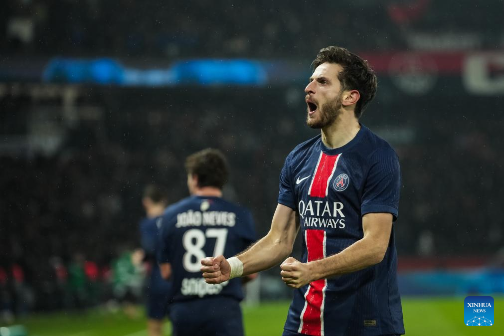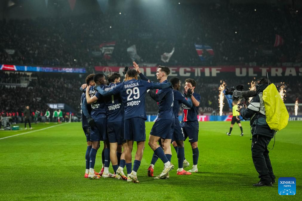 Players of Paris Saint Germain (PSG) celebrate their third goal during a French Ligue 1 football match between Paris Saint Germain (PSG) and AS Monaco in Paris, France, Feb. 7, 2025. (Photo by Aurelien Morissard/Xinhua)