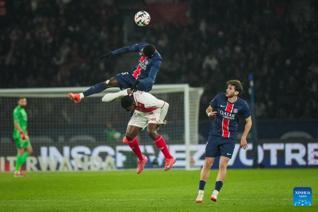 Ousmane Dembele (R, front) of Paris Saint Germain (PSG) vies with AS Monaco's Christian Mawissa (C, front) during a French Ligue 1 football match between Paris Saint Germain (PSG) and AS Monaco in Paris, France, Feb. 7, 2025. (Photo by Aurelien Morissard/Xinhua)