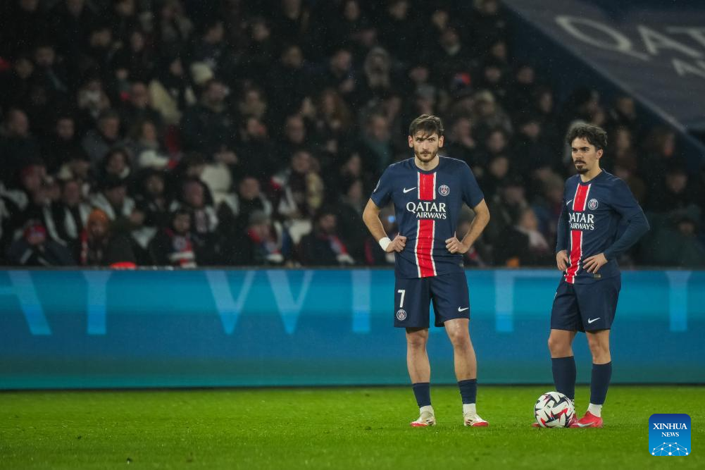 Khvicha Kvaratskhelia (L) and Vitinha of Paris Saint Germain (PSG) wait for a free kick during a French Ligue 1 football match between Paris Saint Germain (PSG) and AS Monaco in Paris, France, Feb. 7, 2025. (Photo by Aurelien Morissard/Xinhua)