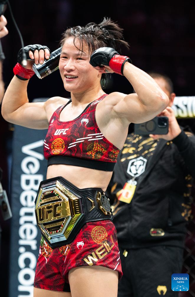 Zhang Weili of China celebrates after the women's strawweight championship at the UFC 312 in Sydney, Australia, Feb. 9, 2025. (Photo by Hu Jingchen/Xinhua)