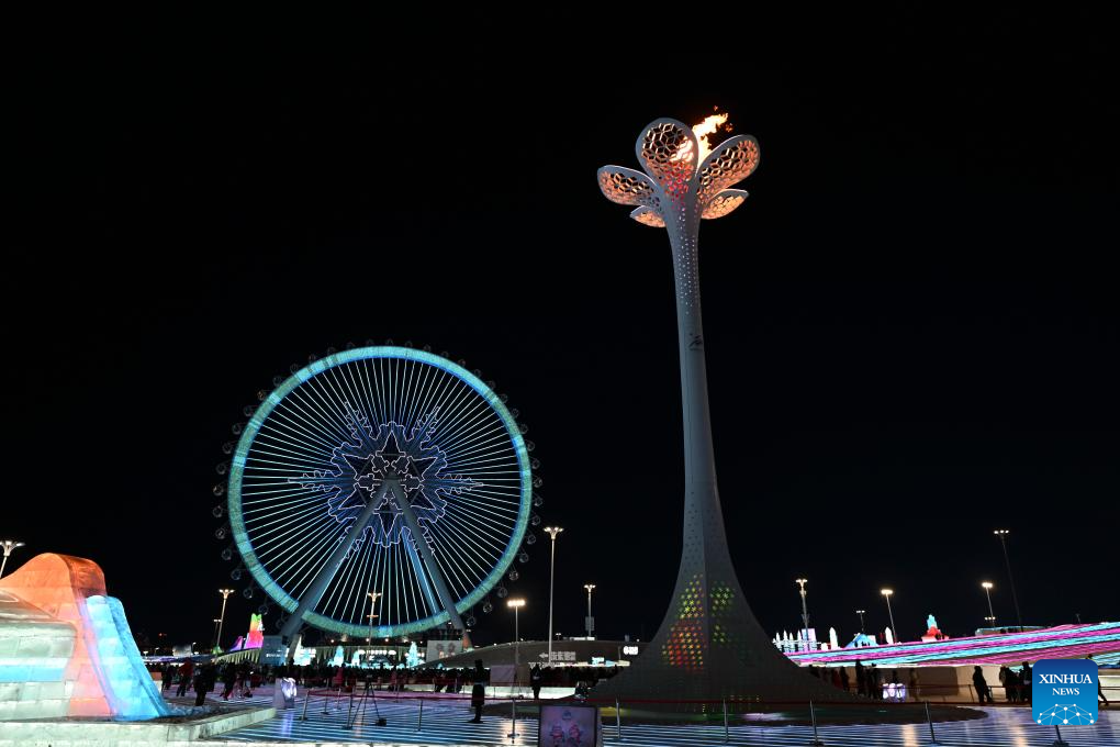 The cauldron is lit at the Harbin Ice and Snow World Park during the 9th Asian Winter Games in Harbin, northeast China's Heilongjiang Province, Feb. 8, 2025. (Xinhua/Huang Bohan)