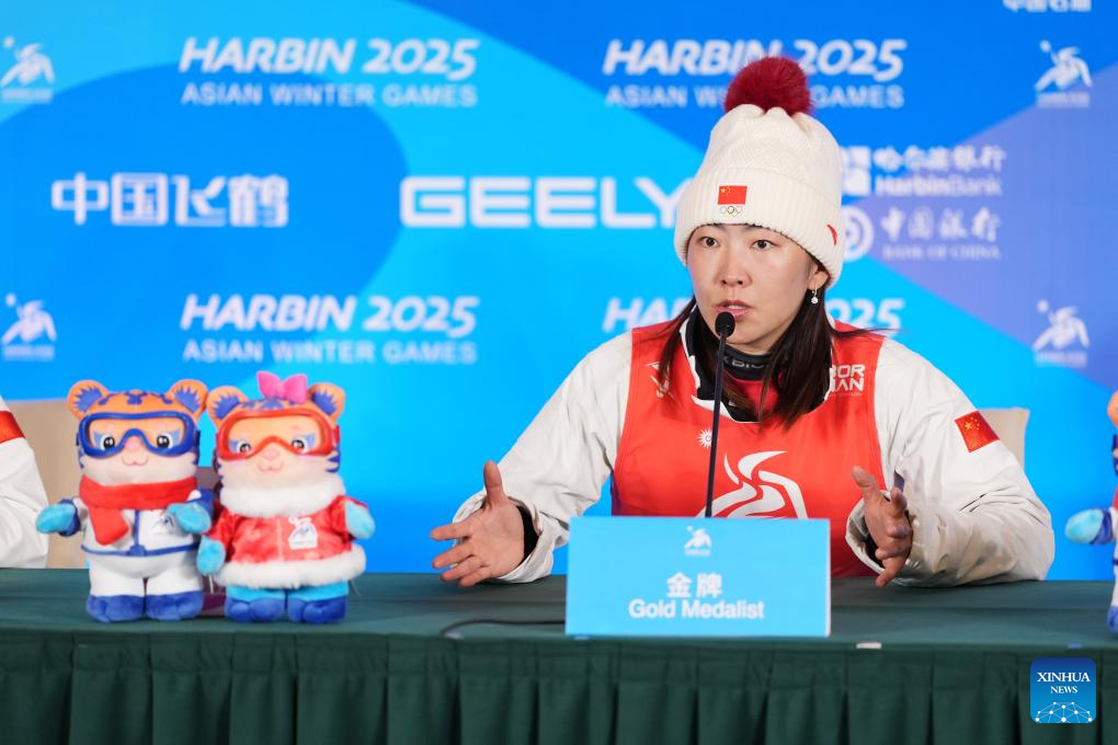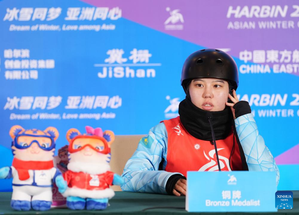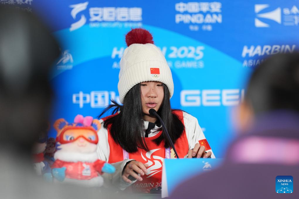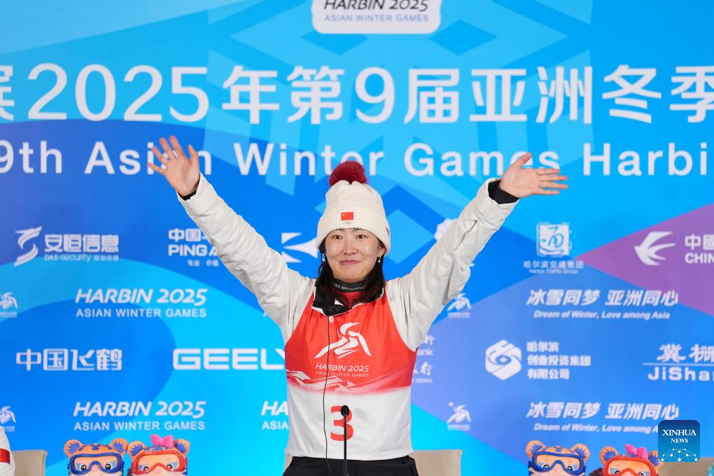 Gold medalist Xu Mengtao of China attends the press conference after the freestyle skiing women's aerials final at the 9th Asian Winter Games in Yabuli, northeast China's Heilongjiang Province, Feb. 9, 2025. (Xinhua/Wang Song)