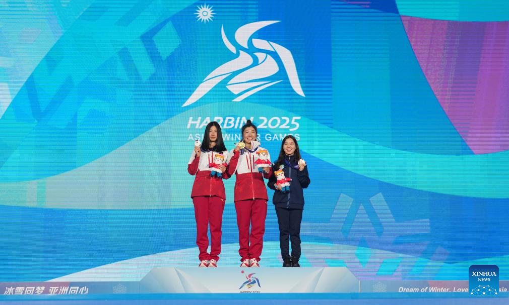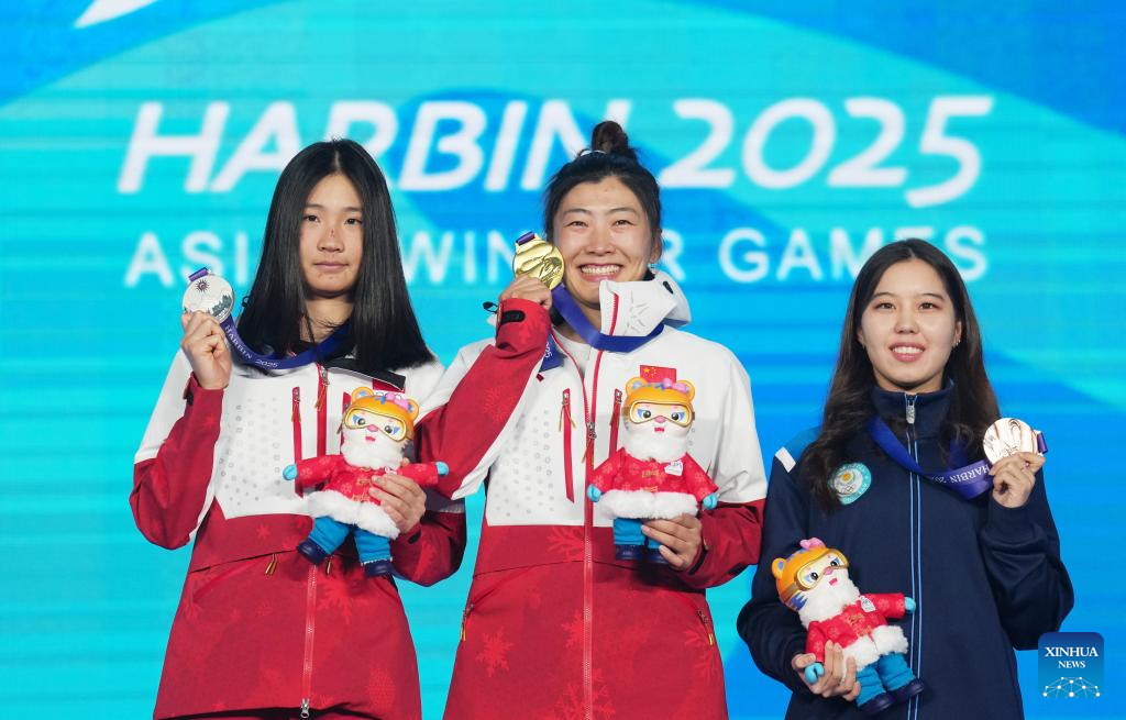 Gold medalist Xu Mengtao (C) of China, silver medalist Chen Xuezheng (L) of China and bronze medalist Ayana Zholdas of Kazakhstan pose during the awarding ceremony after the freestyle skiing women's aerials final at the 9th Asian Winter Games in Yabuli, northeast China's Heilongjiang Province, Feb. 9, 2025. (Xinhua/Wang Song)