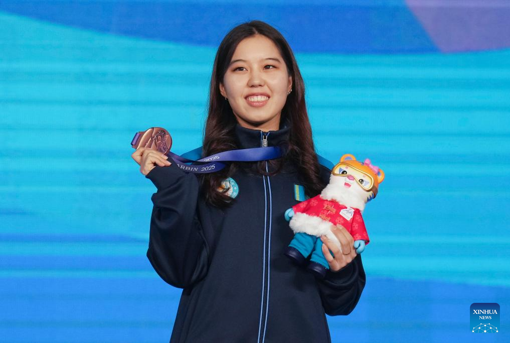 Bronze medalist Ayana Zholdas of Kazakhstan poses during the awarding ceremony after the freestyle skiing women's aerials final at the 9th Asian Winter Games in Yabuli, northeast China's Heilongjiang Province, Feb. 9, 2025. (Xinhua/Wang Song)
