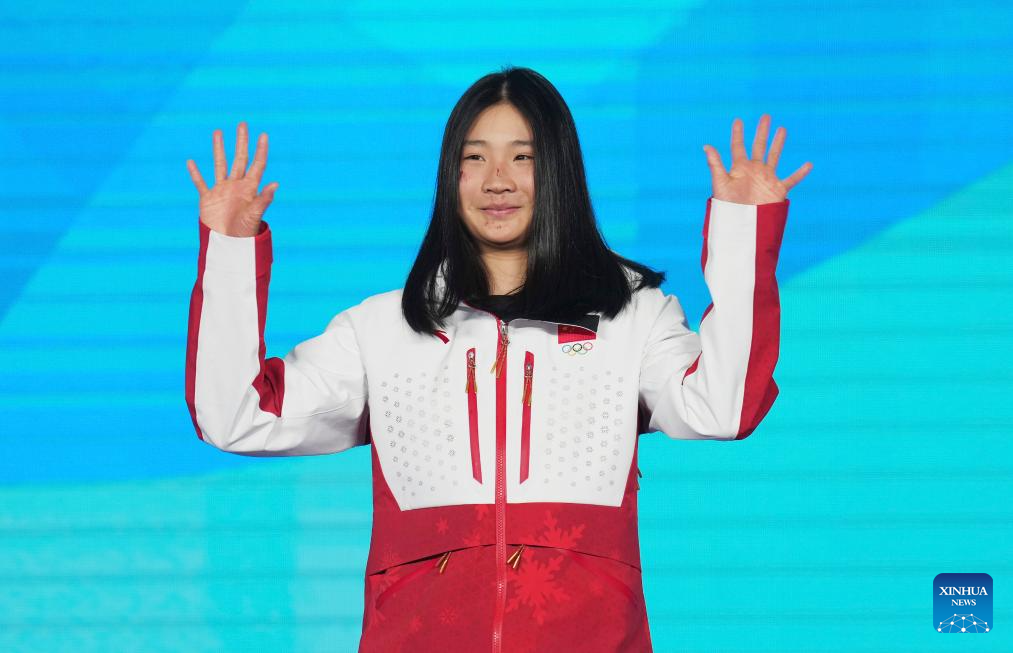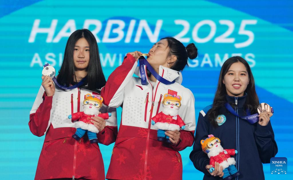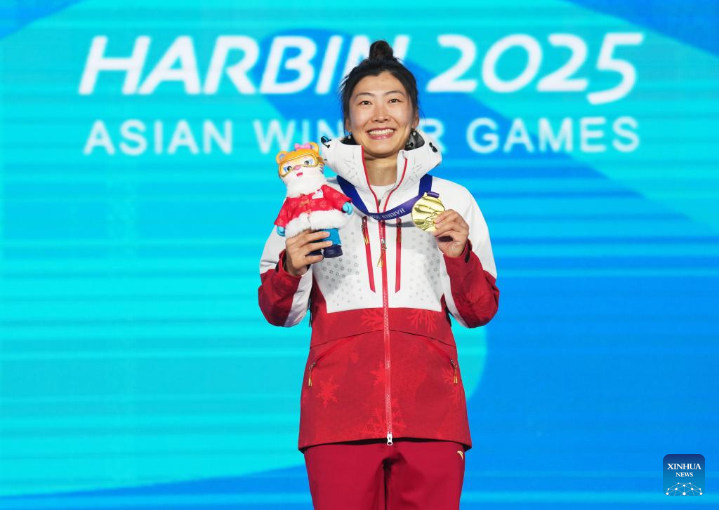 Gold medalist Xu Mengtao of China poses during the awarding ceremony after the freestyle skiing women's aerials final at the 9th Asian Winter Games in Yabuli, northeast China's Heilongjiang Province, Feb. 9, 2025. (Xinhua/Wang Song)