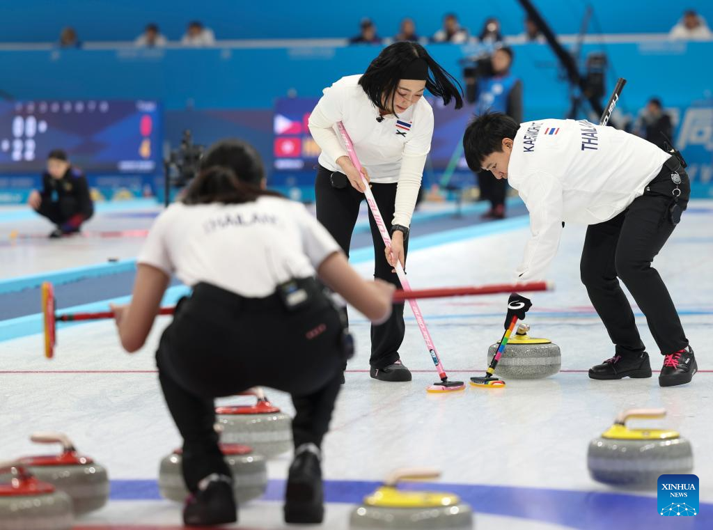 Kanya Natchanarong(C) and Supakan Kaewmorakot (R) of Thailand compete during the Women's Round Robin Session 1 match between China and Thailand of the curling event at the 9th Asian Winter Games in Harbin, northeast China's Heilongjiang Province, Feb. 9, 2025. (Xinhua/Hu Xingyu)