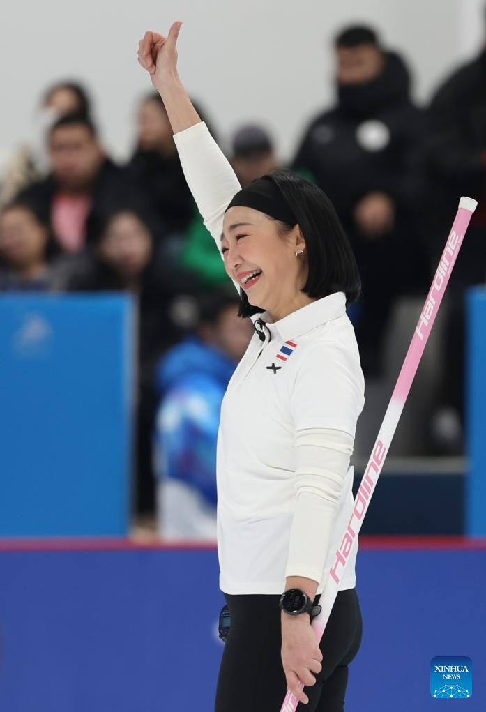 Kanya Natchanarong of Thailand competes during the Women's Round Robin Session 1 match between China and Thailand of the curling event at the 9th Asian Winter Games in Harbin, northeast China's Heilongjiang Province, Feb. 9, 2025. (Xinhua/Hu Xingyu)